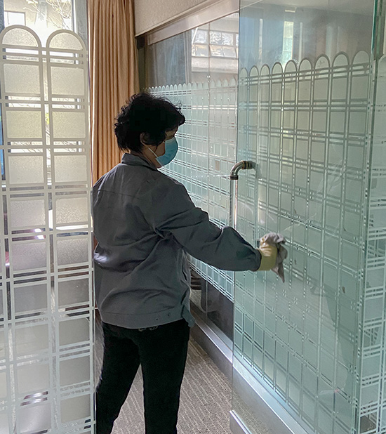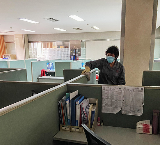 消毒小组每日定时对公司各公共区域地面、电梯间、卫生间及员工经常接触、使用的器具(电源开关、电梯开关、楼梯扶手、门把手、水龙头、沙发、电话、交通工具等)进行消毒。