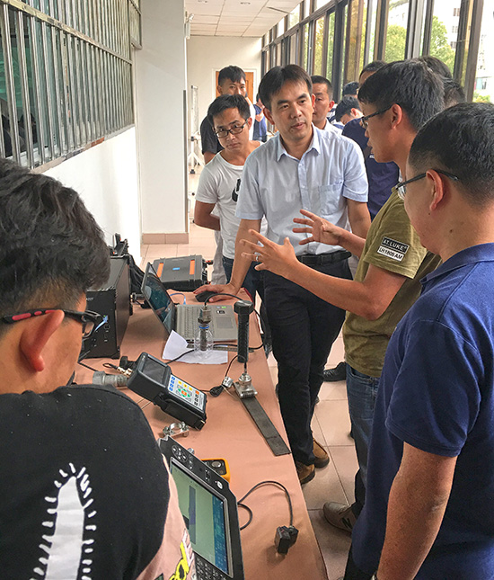 我司项目经理杨贵德工程师介绍了CTS-PA22T相控阵全聚焦(TFM)实时3D超声成像系统新技术及在各类钢结构检测中的应用,先进的缺陷发现能力和3D实时成像,为现场检测提供直观和高效的效果。同时,CTS-PA22A型便携式相控阵超声检测仪、CTS-409型电磁超声测厚仪依次亮相,学员们对新技术、新应用、新仪器均表现出强烈的兴趣。