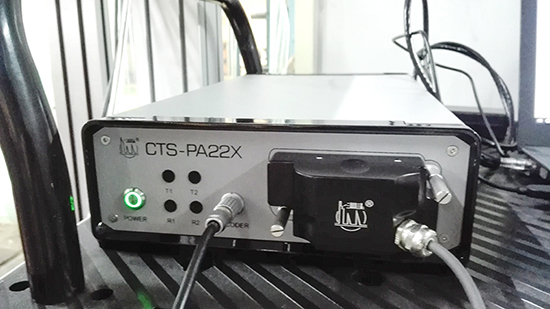 相控阵仪器部分采用了一台CTS-PA22X仪器,配置为32:128通道相控阵,不搭配常规通道。连接一个32阵元线性探头,晶片间距1.0mm,楔块角度55度,楔块耦合面带弧度,与轴身轴颈弧度吻合。CTS-PA22X仪器具有两个编码器接口,其中一个接口与探头夹具上的编码器连接,以获得探头扫查时的周向位置,并传送给上位机软件。