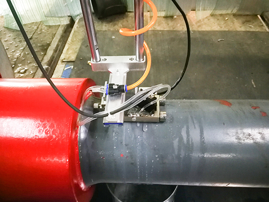 机械部分由移动式龙门架、探头夹具及工具小车构成,龙门架设计为可移动式,装有四个轮子,可移动到指定位置并锁定。探头夹具安装在龙门架上,可沿水平和垂直方向移动,带有弹力耦合机构及耦合液(水)喷淋功能,保证探头与轴身轴颈的耦合。探头夹具同时安装一个旋转编码器,以获得探头扫查的周向位置。工具小车用于承载控制箱、水箱、上位机电脑及相控阵仪器,可随龙门架一起移动。
