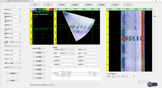 软件代码参照了CTS-PA22X仪器提供的PA22X-DEMO源代码,扇扫图直接将CTS-PA22X仪器发送过来的图像数据贴图,A型波直接根据接收到的A型数据连线绘图即可。C扫图需要稍做处理,截取扇扫图相应深度数据做投影,再依据数据包内嵌的周向编码器读数,画到C扫图像相应位置。参数调节功能实现也很简单,将输入参数格式化为一条命令字符串,再发送给CTS-PA22X仪器即可。由于CTS-PA22X仪器已经完成了扇扫、A型波、法则计算等功能,大大降低了软件开发的工作量,整个轮轴相控阵探伤软件开发及调试只花了一个半月时间。