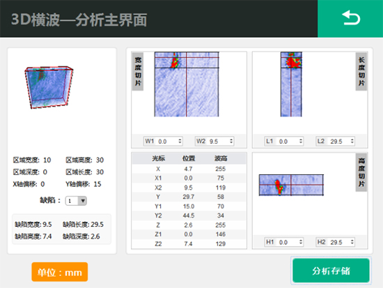 3. 利用汕头超声公司最新研制的CTS-PA22T型相控阵全聚焦实时3D超声成像系统,对埋藏硬α夹杂缺陷定期检测成像记录并进行定量测量,研究硬α夹杂缺陷出现、扩展到失效的生长规律。