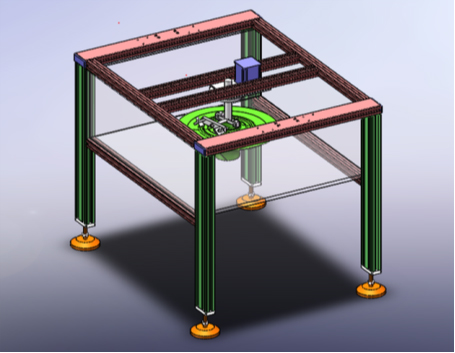 机械系统设备外形尺寸高度为600mm,长600mm,宽600mm。水箱外壁采用透明亚克力,可以方便看到工件的检测位置。水箱高度270mm,工作蓄水量约为85升。水箱底部有一圆形凸台,可以定位涡轮盘并使其固定,根据检测的涡轮盘规格不同,可更换圆形凸台。检测相控阵探头垂直上下升降采用电机带动,下探深度自动检测到位,由接近开关实现闭环控制。