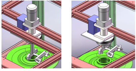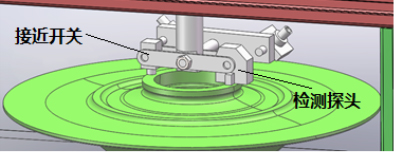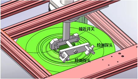 检测工装利用平衡结构的原理,一边是检测探头,对应另一边是接近开关,检测工作时,探头自动下降到指定位置,触发接近开关,这样可以有效的实现检测探头自动定位。当检测探头到达指定深度时,另一电机启动,通过齿轮传动使检测探头进行圆周扫查的动作。在涡轮盘顶面检测时,检测探头距离涡轮盘一定距离。