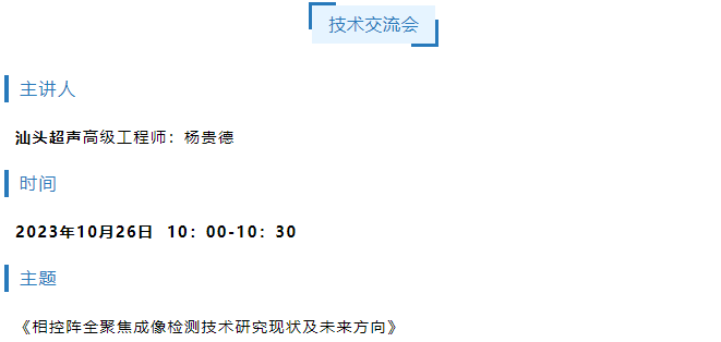 汕头超声为本届展会精心安排由杨贵德高级工程师在10月26日10时做《相控阵全聚焦成像检测技术研究现状及未来方向》的专题报告,与大家分享最新的检测技术、应用成果和经验,欢迎大家光临报告会现场。我们欢迎和期待您光临展台(展位号:1131),并对我们的产品和服务提出宝贵意见和建议。