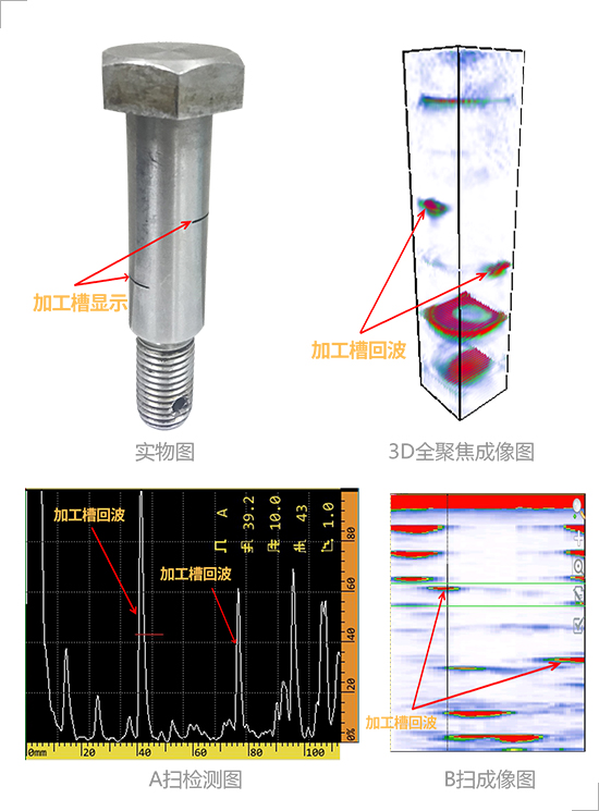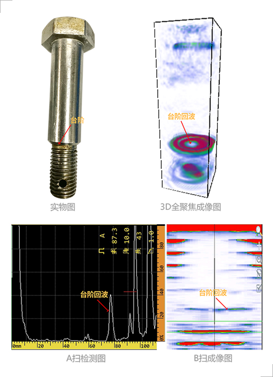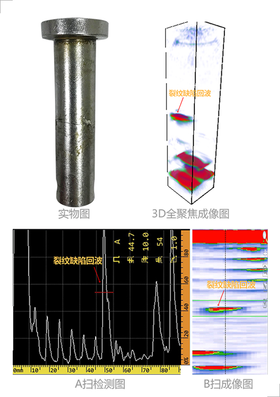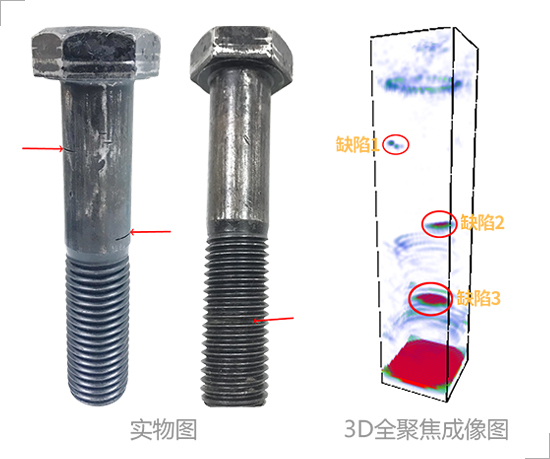 3D total focus real-time detection imaging can be rotated for observation with simple defect identification and fast detection speed. The average detection time of a bolt is 2 seconds. The detection result is reliable and the damage is easy to observe which can effectively avoid the defect omission. Not only that the system provides the function of defect analysis and storage which can accurately locate and quantitatively measure the internal defects of the detected bolts.
