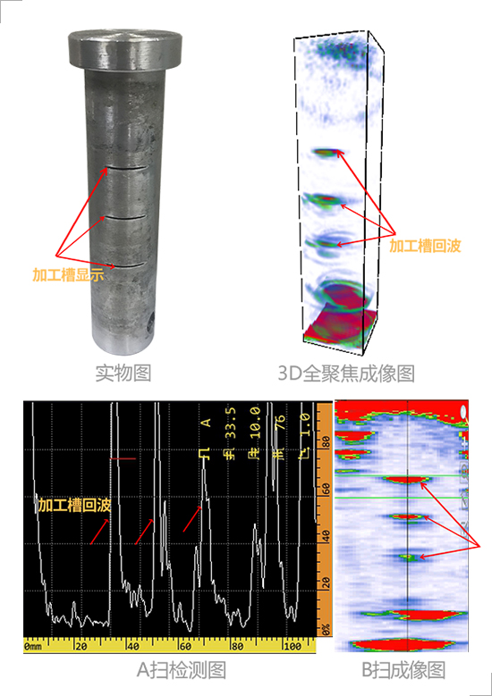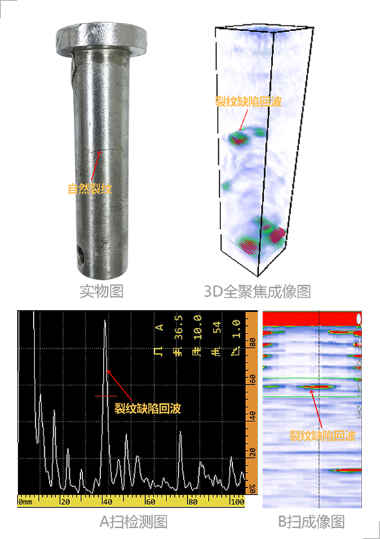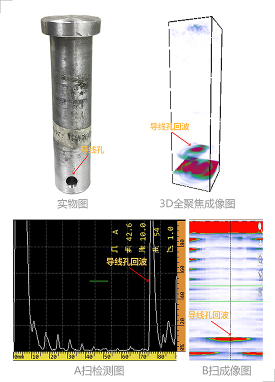 According to the above cases through A-scan inspection chart B-scan image and 3D total focus technology inspection imaging in the pin without defects 3D total focus imaging chart only has conductor hole echo and bottom wave and conductor hole imaging is clear. For the pin with defects the echo waveform location and size of natural cracks can be observed by 3D total focus technology.
