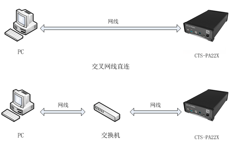 一套完整的探伤系统由监控主机、CTS-PA22X相控阵检测模块、相控阵探头及相关扫查装置组成。CTS-PA22X是一个独立的模块,通过网线与监控主机相连。运行在监控主机上的软件通过网络接口向CTS-PA22X发送指令,并接收CTS-PA22X回传的数据。