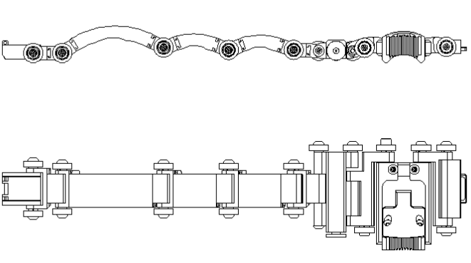 该扫查器采用链式设计,依据检测管径的大小可自由安装和拆卸链接关节,可选择单链单侧SCQsp-1DL和双链双侧SCQsp-1SL同时检测两种配置方案。利用CTS-PA22A 软件对小管径管件上的周向焊缝进行检测。此外,汕头超声还提供为适用于各种直径的管件而专门设计的薄型楔块,与SCQsp-1扫查器同时使用。