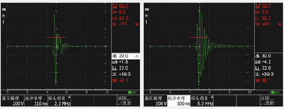 当方波宽度为探头频率周期一半时(5MHz,对应约100ns),此时灵敏度最高。