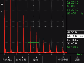 “波形扩展”功能,将闸门内波形扩展至全屏幕,以便看到波形细节及提高分辨力。