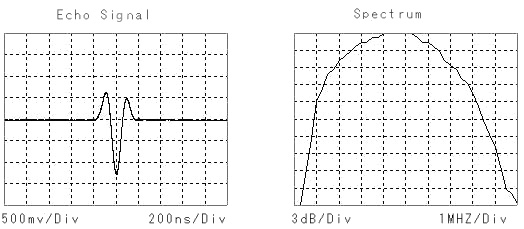 | 测试条件 发射电压:100v 脉冲宽度:200ns 重复频率:200Hz 增益:-16dB 试块:10mm PS | 测试结果 -20dB回波脉冲宽度(T10):314.8ns 中心频率(f0):4.62MHz -6dB相对带宽(B-6):116.5% 相对回波灵敏度(Srel):-35.6dB |